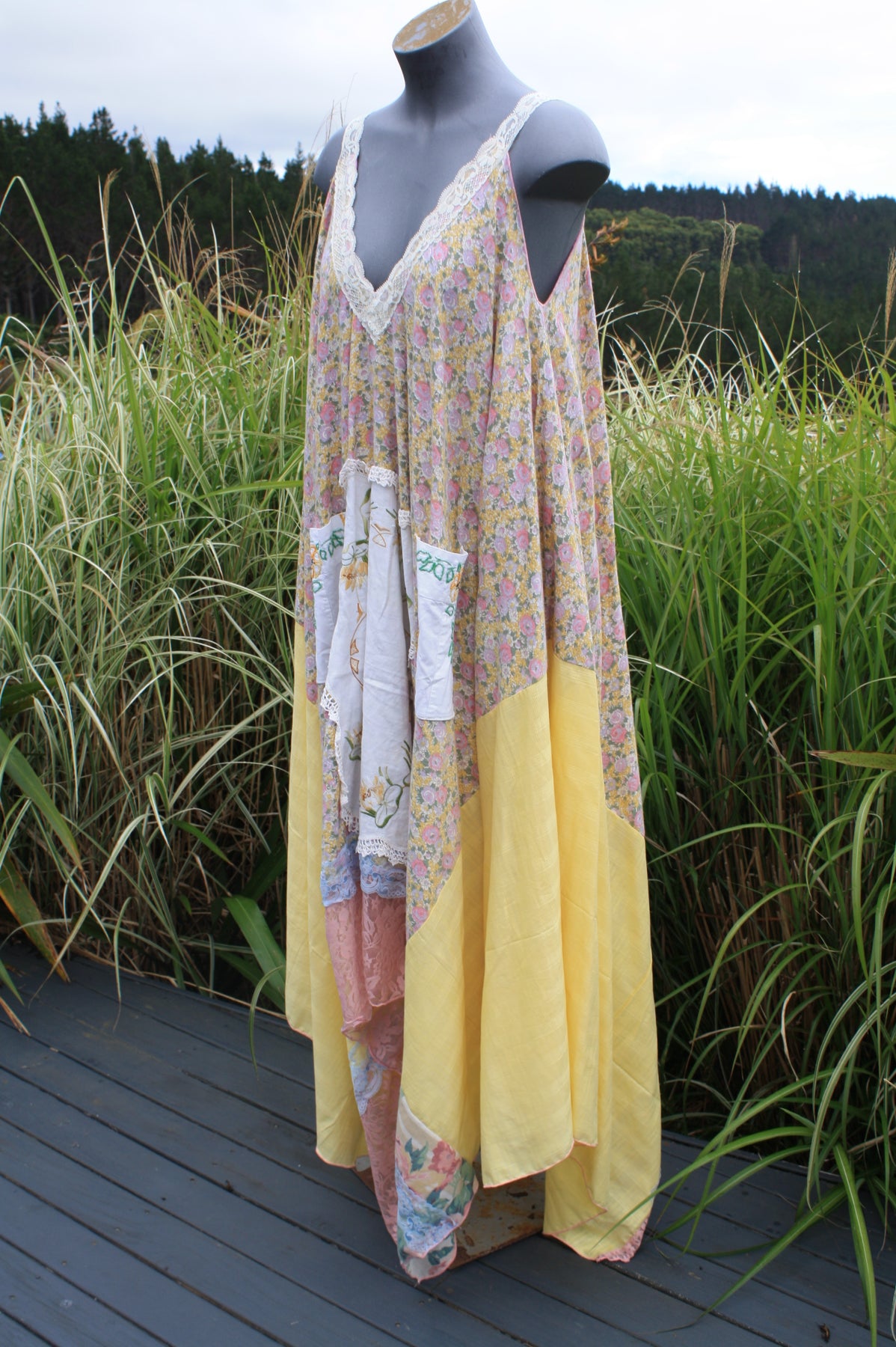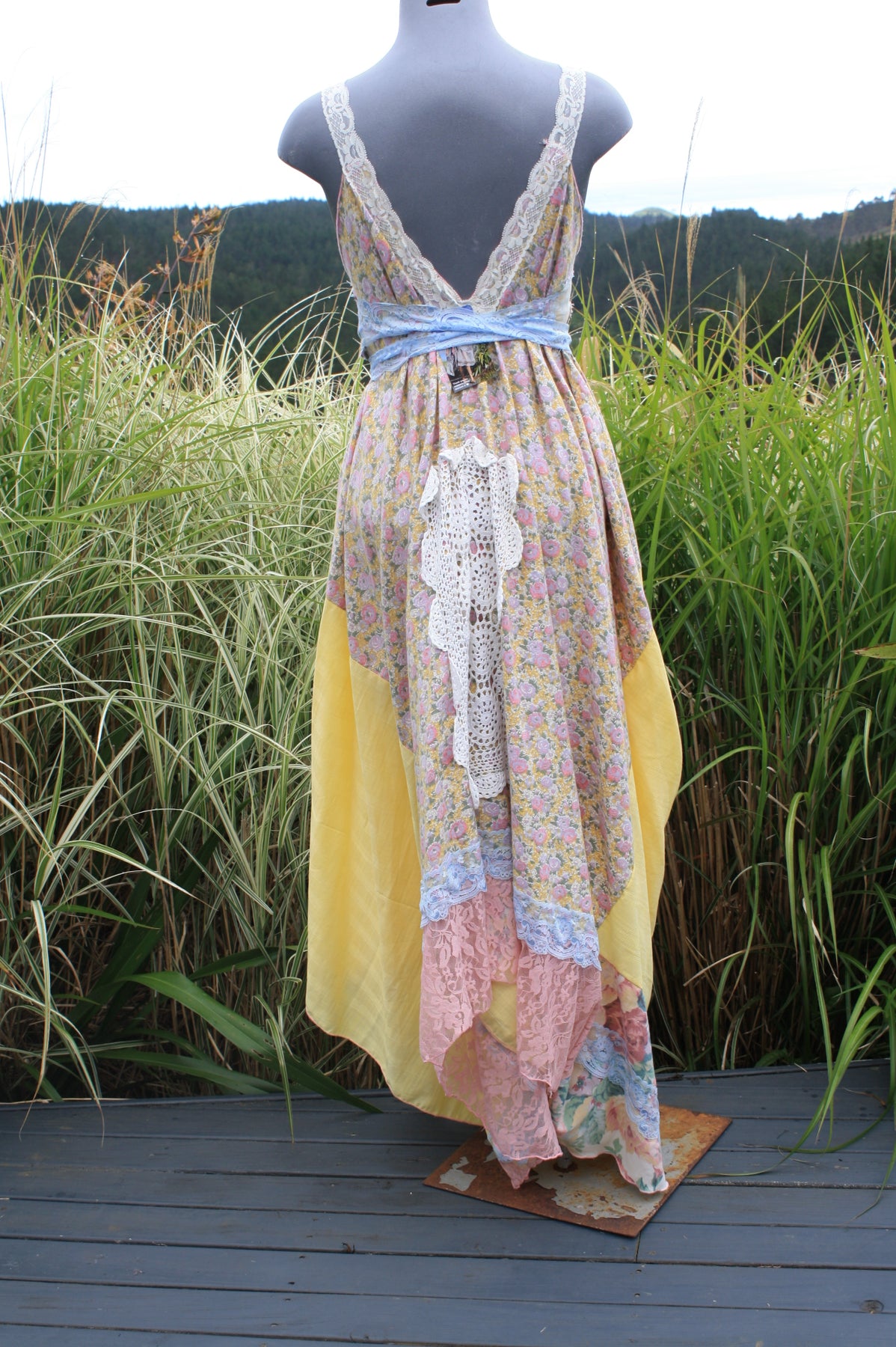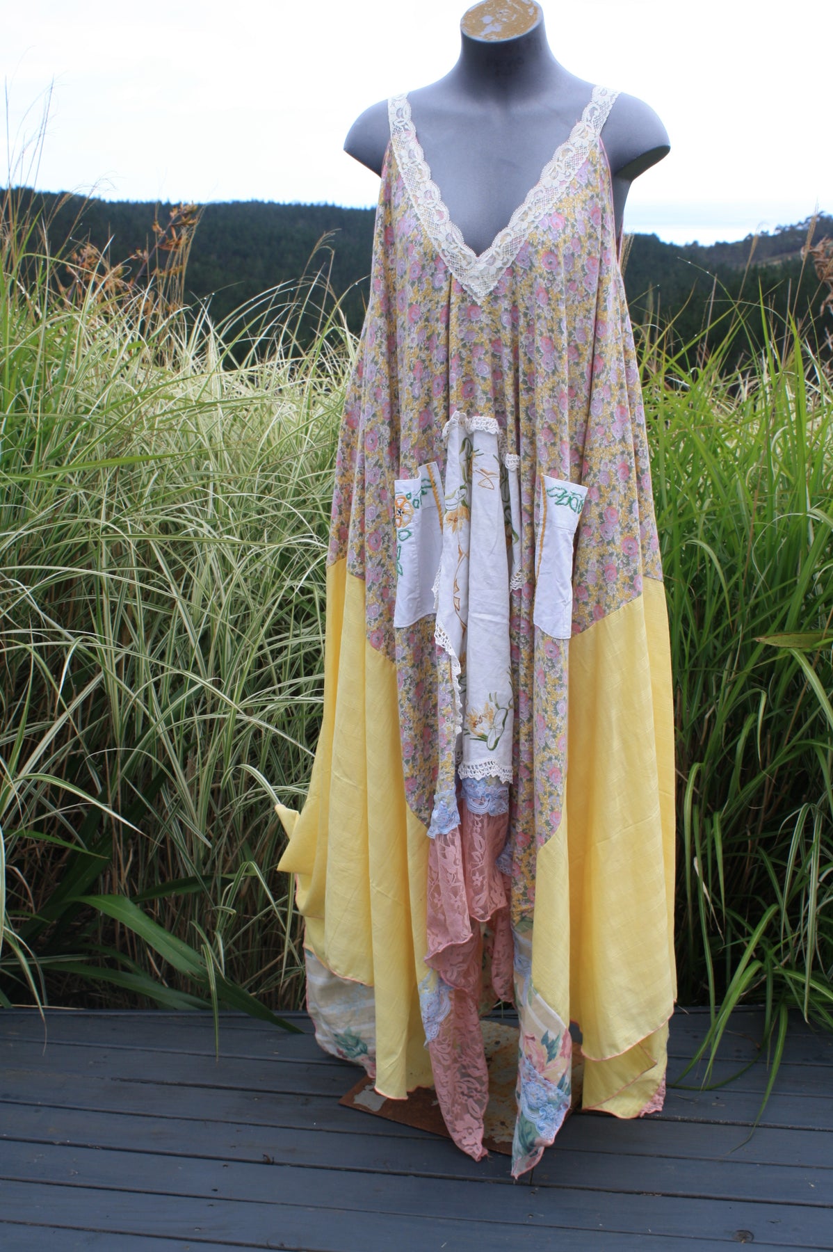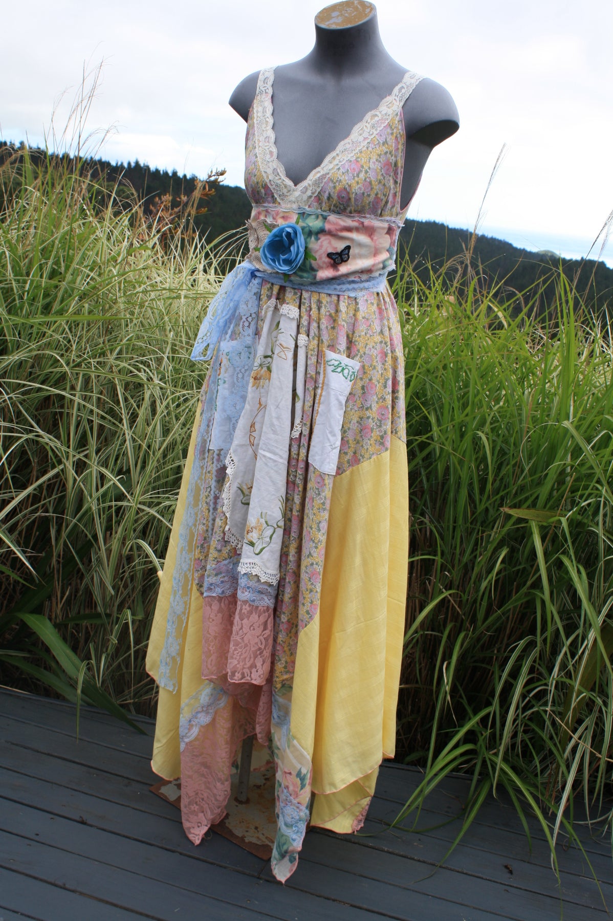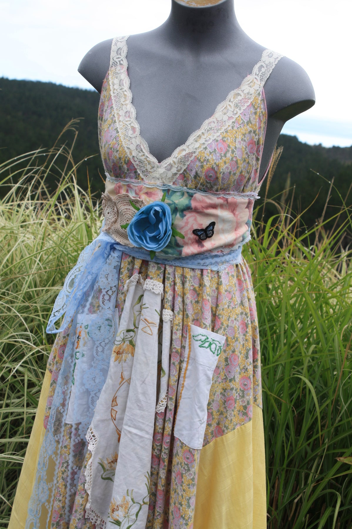 Transform yourself into an ethereal Goddess with our Sunshine wearable art handcrafted from upcycled and repurposed materials. This stunning dress features hand-dyed teal and forest green layers, delicate lace and vintage doily accents, perfect for a boho celebration or ceremony. Embrace your creative side and feel like a true forest Faery in this one-of-a-kind piece.