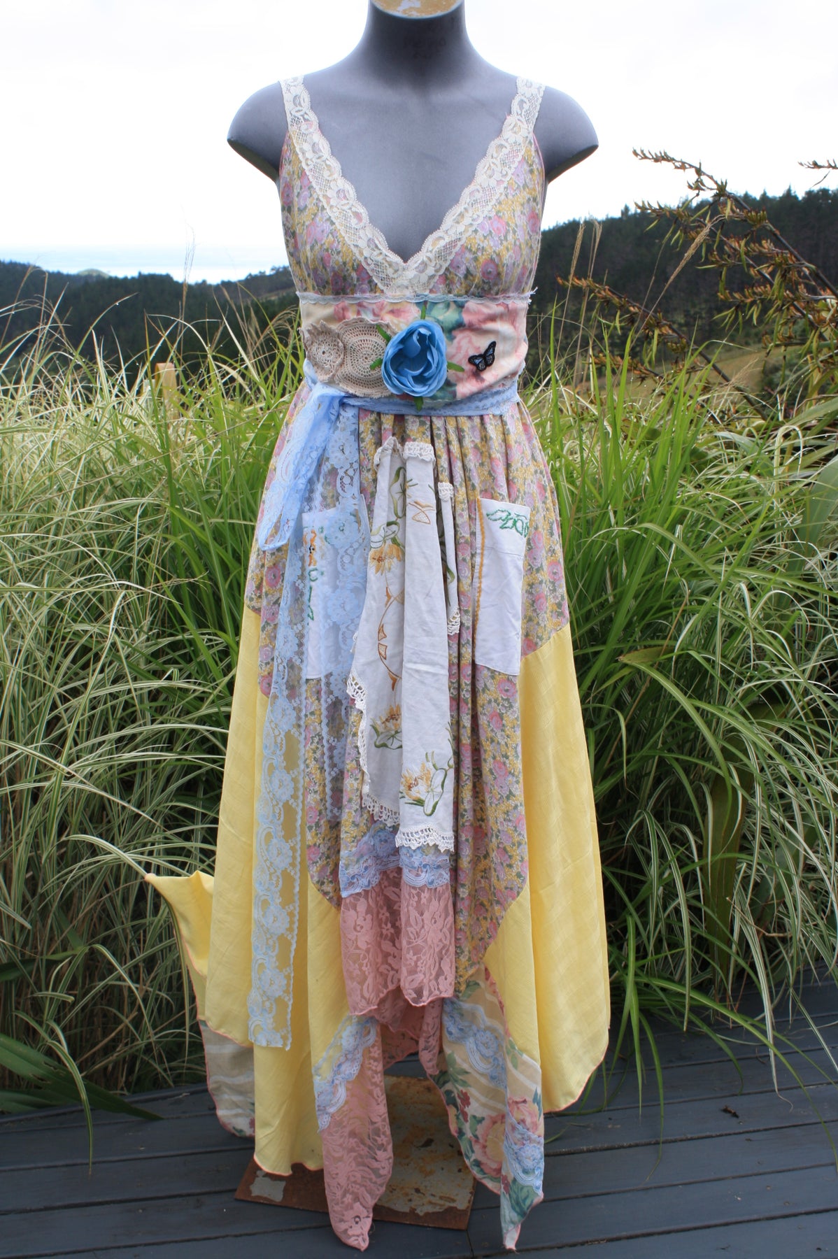 This one of a kind pieces of wearable art was carefully crafted from using something old and something new, repurposing them into a fresh eye catching dress and hand dyed and completed with a unique basque belt.