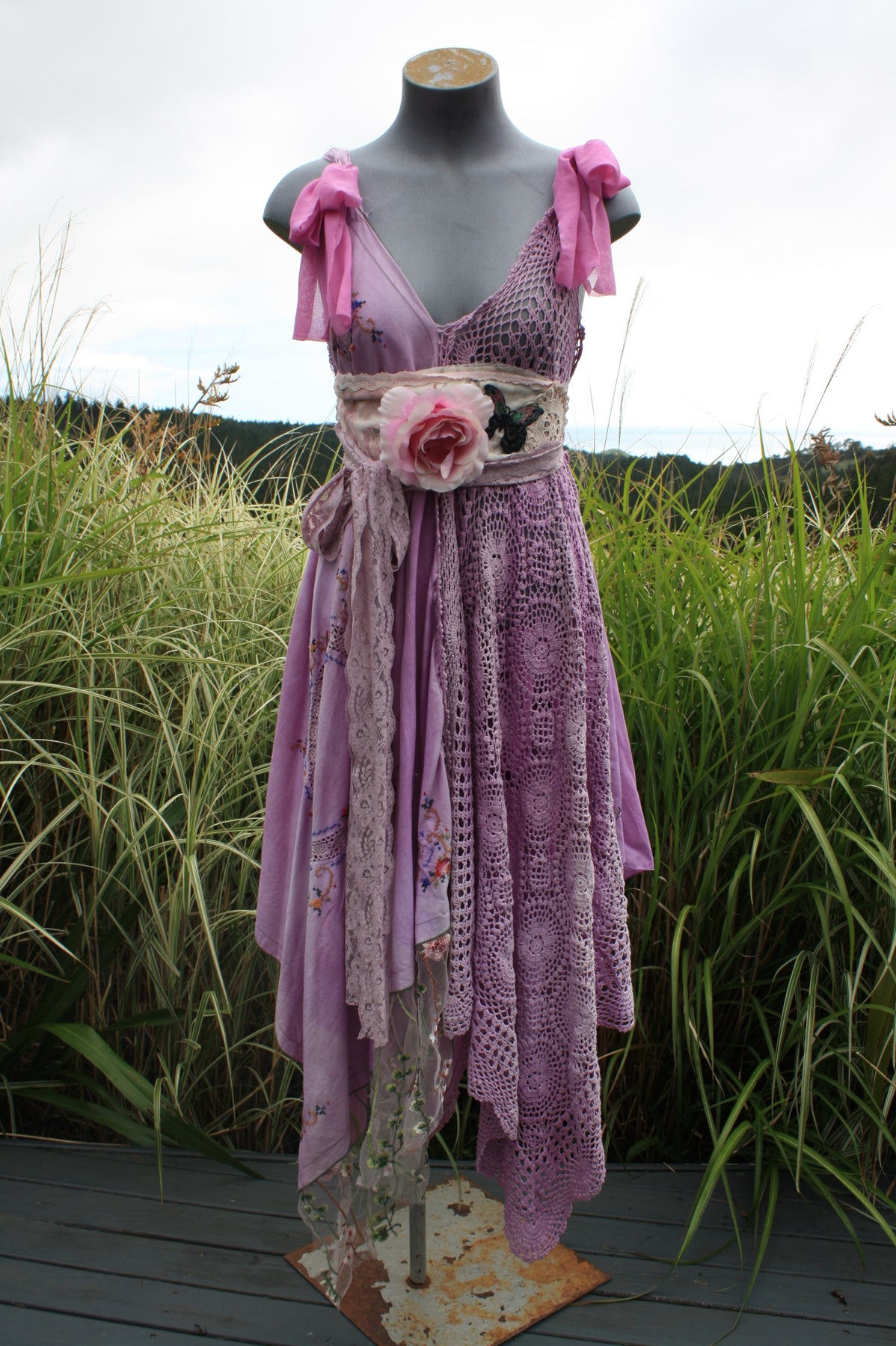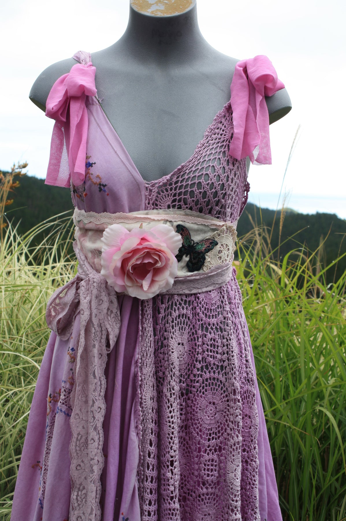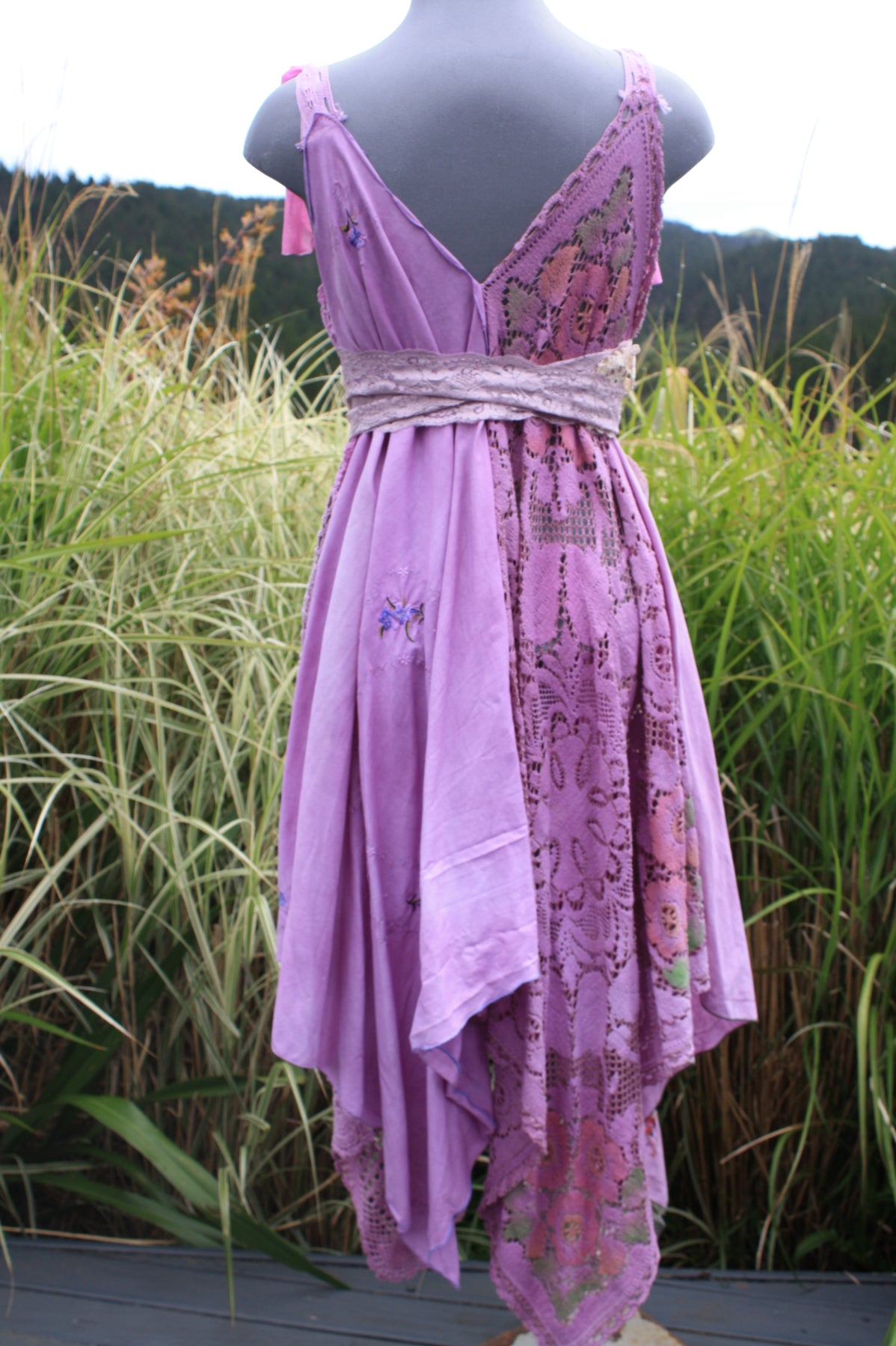 Transform yourself into an ethereal Goddess with our Lavender Dream wearable art handcrafted from upcycled and repurposed materials. This stunning dress features hand-dyed teal and forest green layers, delicate lace and vintage doily accents, perfect for a boho celebration or ceremony. Embrace your creative side and feel like a true forest Faery in this one-of-a-kind piece.