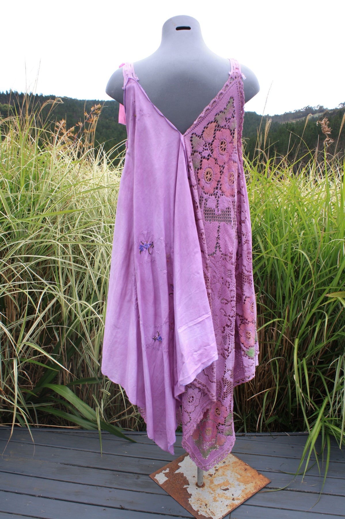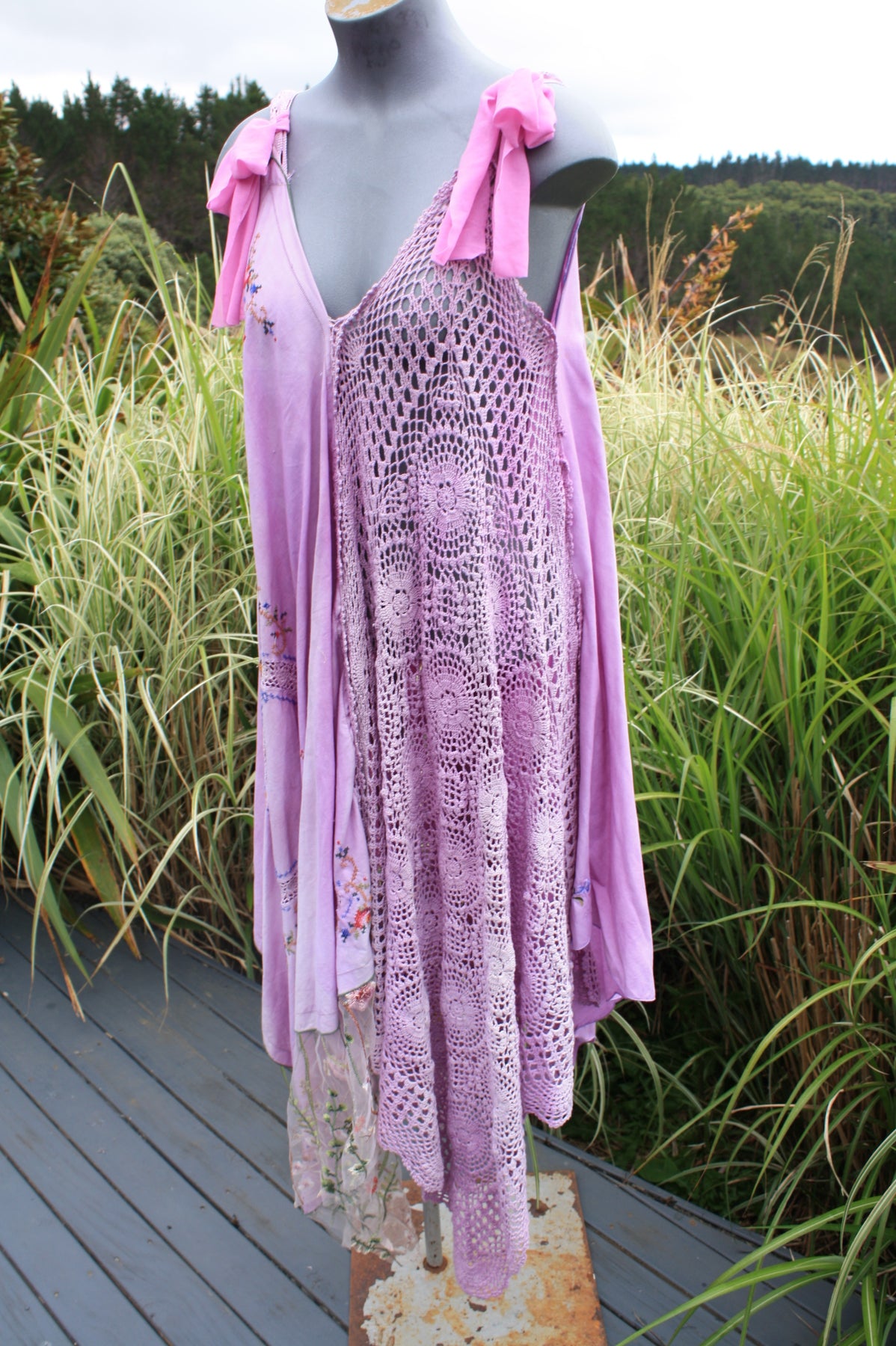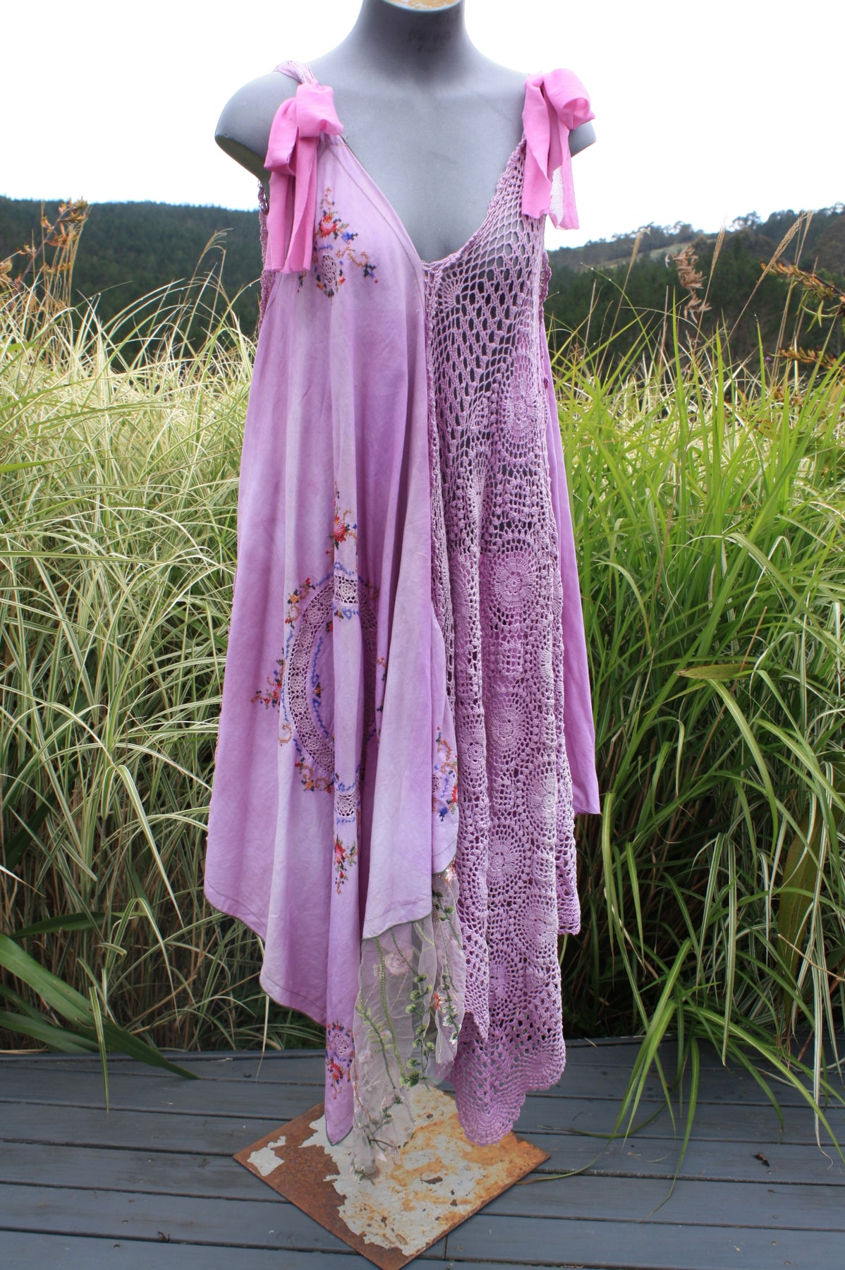 Transform yourself into an ethereal Goddess with our Lavender Dream wearable art handcrafted from upcycled and repurposed materials. This stunning dress features hand-dyed teal and forest green layers, delicate lace and vintage doily accents, perfect for a boho celebration or ceremony. Embrace your creative side and feel like a true forest Faery in this one-of-a-kind piece.